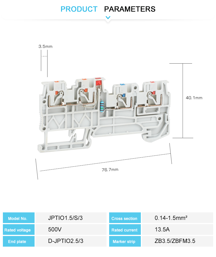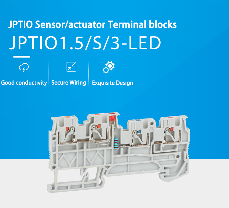 JPTIO1.5/S/3-LED(24V) كتلة طرفية تعتمد كتلة طرفية نايلون مثبط للهب PA66 وموصل نحاسي ونابض ضغط من الفولاذ المقاوم للصدأ لضمان السلامة الكهربائية والقوة الميكانيكية في ظل ظروف العمل القاسية.