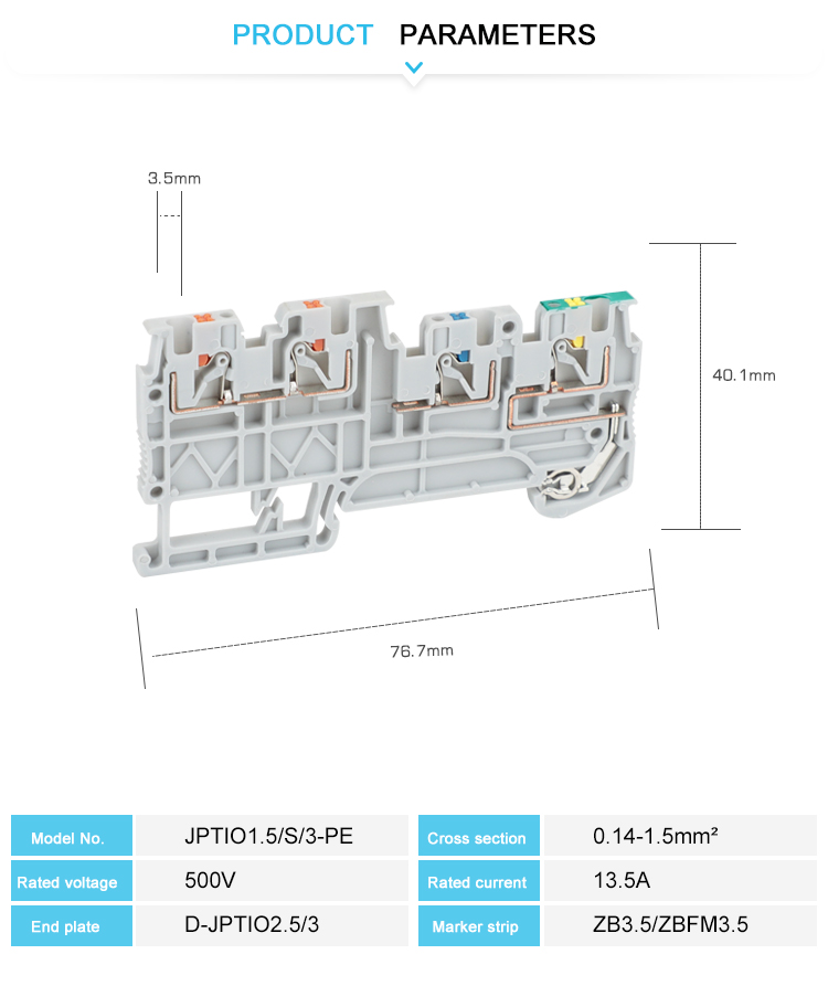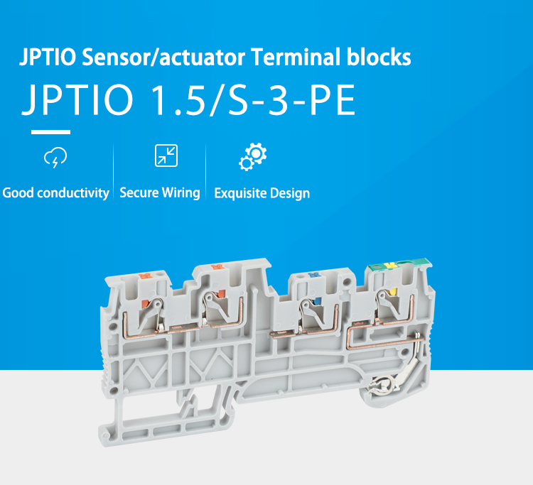 JPTIO1.5/S/3-PE كتلة المحطة تستخدم كتلة المحطة نايلون مثبطات اللهب PA66 وموصل نحاسي ونابض ضغط من الفولاذ المقاوم للصدأ لضمان السلامة الكهربائية والقوة الميكانيكية في ظل ظروف العمل القاسية.