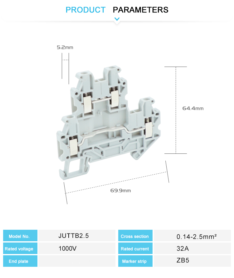 تم تصميم كتلة طرفية UTTB2.5 Dual Stage Terminal خصيصًا للاتصالات الكهربائية الفعالة والآمنة في البيئات الصناعية والتجارية. بسعة 2.5 مم مربع ، فهي مناسبة للسيناريوهات الحالية المنخفضة والمتوسطة. من السهل تثبيت سكة DIN ويوفر بنية مرحلتين المساحة. اتصال المسمار مضاد للهواء ومقدّم الهواء ، متوافق مع الأسلاك النحاسية الثابتة/الملتوية. مواد عالية الجودة متثقيتها هي مقاومة للحرارة ومقاومة للأثر ، وتلبية معايير الصناعة. فهي مناسبة لخزائن التحكم ، وأنظمة توزيع الطاقة ، وما إلى ذلك ، وتوفير حلول اتصال موثوقة.